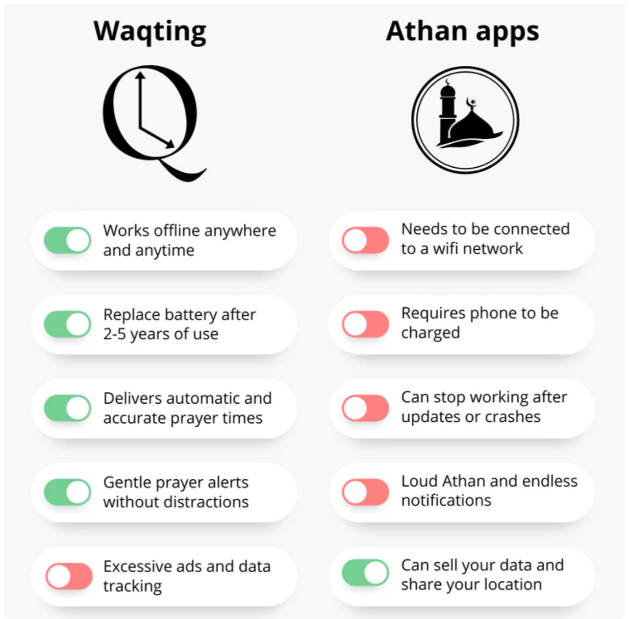 Waqting is not trying to replace your phone or track your fitness. It exists for one main purpose: to support prayer without distraction. You get features that serve your worship directly, including:
